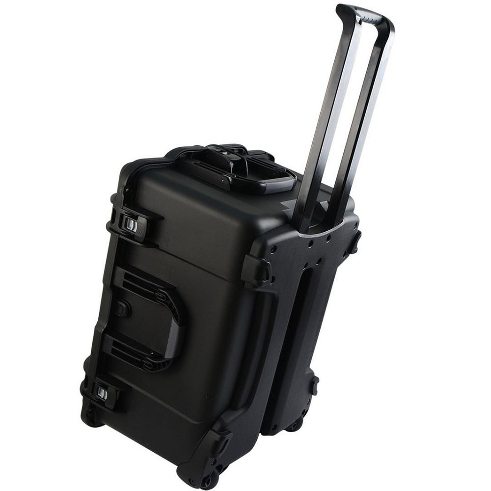 Black injection molded case with pullout handle and inline wheels. Interior dims 22 x 17 x 12.9 inches. NO FOAM.