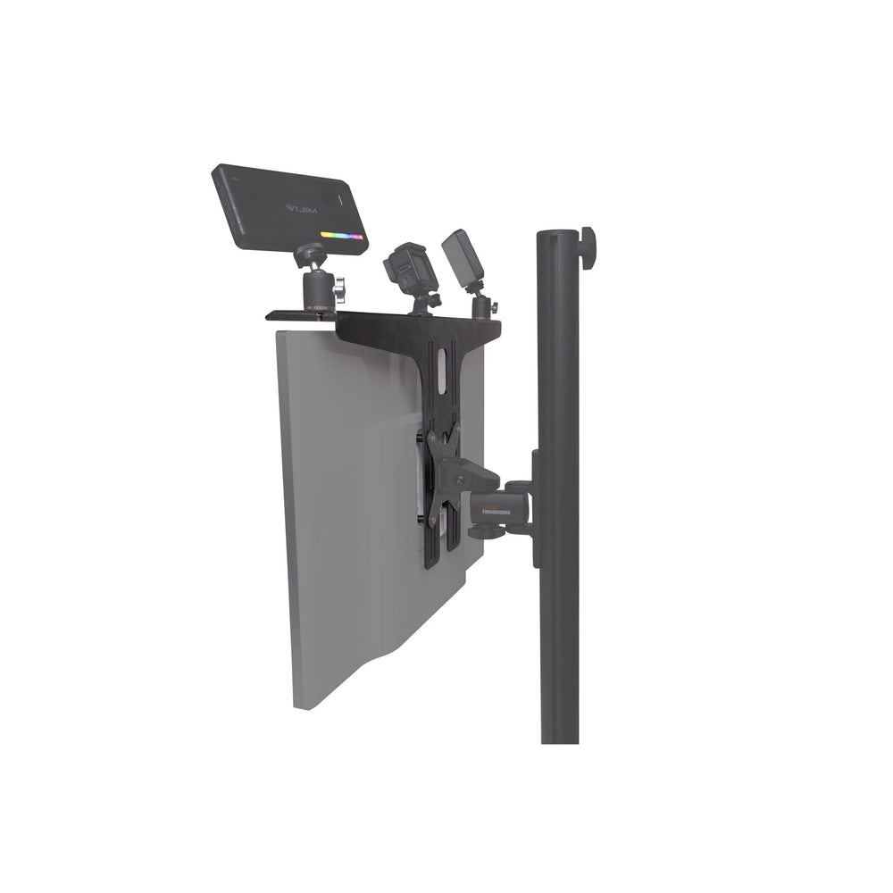 Enhance your video conferencing, remote learning, content creation, video tutorials, and other similar applications with the VESA Mount Video Conference and Streaming Accessory Shelf. The shelf mounts easily to VESA equipped computer displays supporting 75x75 or 100x100mm VESA patterns. It boasts 31 angled slots for mounting accessories with 1/4”-20 threads, and a multi-adjustable design featuring three different height options and reversible positioning (forward or backward). This shelf is compatible with DSLR and mirrorless camera bodies, GoPro cameras, smartphones, LED lights/ring lights, and more.