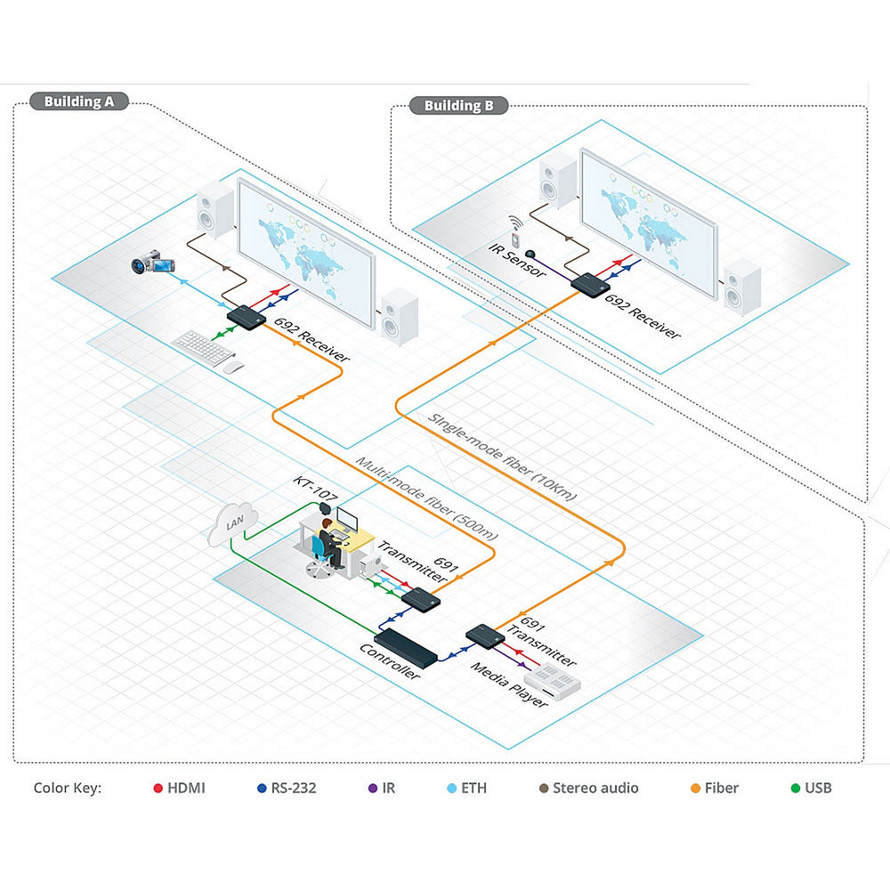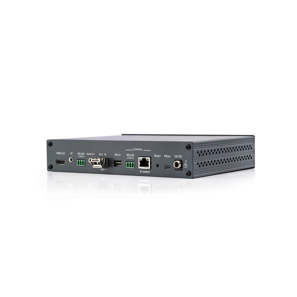The Kramer 692 is a high-performance HDMI receiver that accepts HDMI, USB, Ethernet, RS‑232, IR, and stereo audio over single-mode or multi-mode fiber. It supports transmission of uncompressed 4K60 (4:2:0) video signals over ultra-long distances and integrates multiple control and audio channels in a compact format.