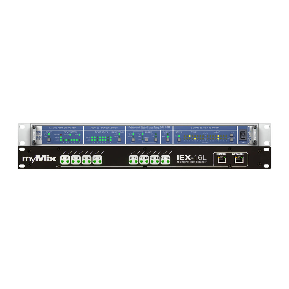 This interface is ideal when using more than 16 channels from a console in MADI format. The MADI-16 is a package of one IEX16L-A with the RME ADI-648 MADI to ADAT interface. For more than 16 channels, simply add one more IEX16L-A per 16 channels for a maximum of 64 channels. MADI, ADAT and the myMix protocol are all 24-bit/48kHz signals so no audio signal quality is lost due to sample rate conversion. As the myMix system generates its own clock, there is no need to feed any master clock: simply connect the MADI cable to the ADI-648 input and use TOSLINK cables to forward the signals to the IEX16L-A. If you use multiple IEX16L-A with the ADI-648 you might want to consolidate them with a switch to return a single CAT5(6) cable to the main switch. Ideal models are the Power8 and the Multi 8.