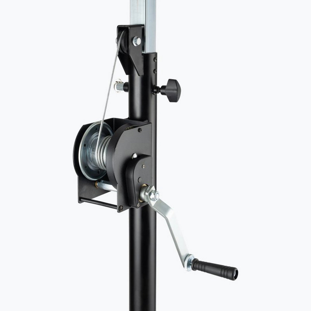 The On-Stage LS9900B Crank-Up Lighting Stand is a robust and portable solution designed for professional lighting and speaker setups. Ideal for theaters, outdoor venues, and performance spaces, this stand offers a height adjustability range from 74" to 157.5", allowing for versatile configurations. The hand-cranked ratcheting winch system ensures safe and effortless raising and lowering of mounted equipment, making setup and teardown processes efficient and ergonomic.