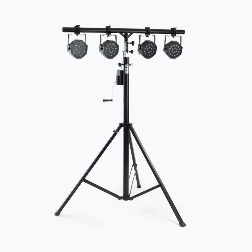 Constructed from durable steel, the LS9900B features a braced tripod base with lengthy legs and non-slip rubber feet, providing outstanding stability and load balance. The detachable T-bar at the top of the shaft accommodates up to four lighting fixtures, including PAR cans, LEDs, spots, lasers, projectors, and moving heads, with a maximum load capacity of 185 lbs. For ease of transportation and storage, the stand folds down compactly, and the T-bar can be detached.