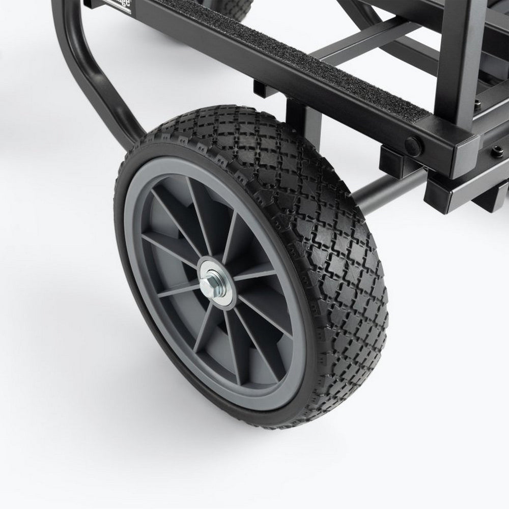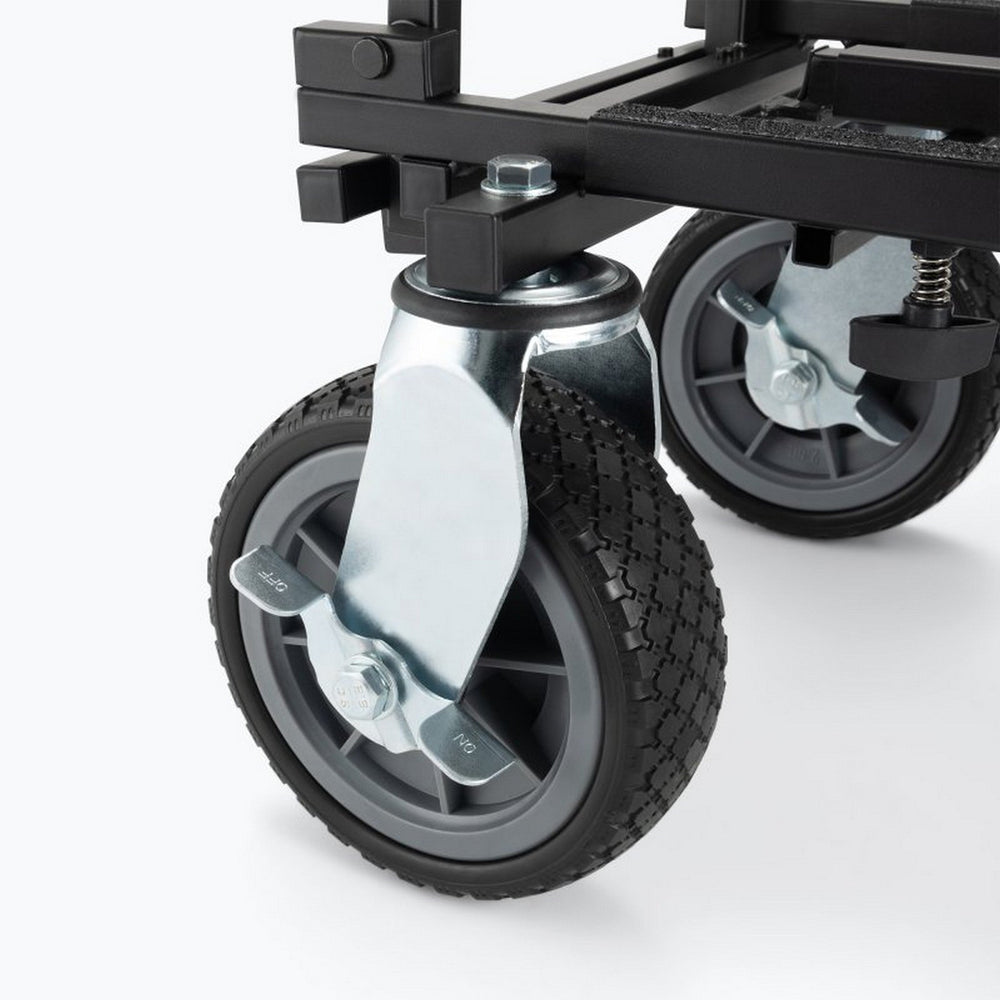 Designed with user convenience in mind, the UTC5500 features ergonomic handles at both ends, which can be folded flat to facilitate the transport of oversized items. The cart is equipped with large, treaded wheels—8" swivel casters at the front and 10" fixed wheels at the rear—ensuring smooth movement over uneven surfaces such as grass, gravel, and dirt. Locking front casters provide stability during loading and unloading, while integrated eyelets on the frame allow for secure attachment of straps to keep equipment in place. When not in use, the cart folds down to a compact size for easy storage and transport.
