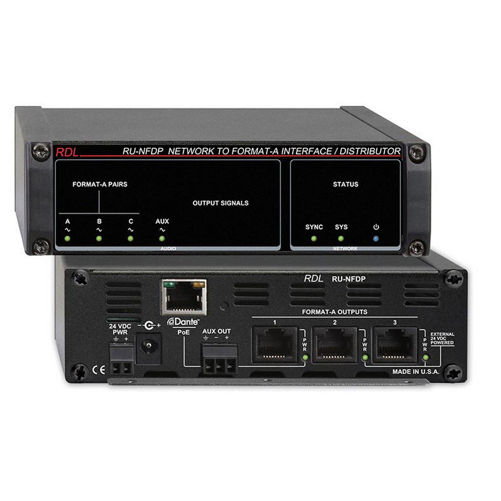 The RU-NFD is designed for use as an RDL Format-A sender/distributor and is compatible with a Dante-enabled network. It easily converts three Dante audio channels to RDL Format-A, with each network channel corresponding to Pair A, B, or C of the Format-A outputs. Additionally, the unit converts a fourth Dante audio channel to a balanced line-level AUX output.