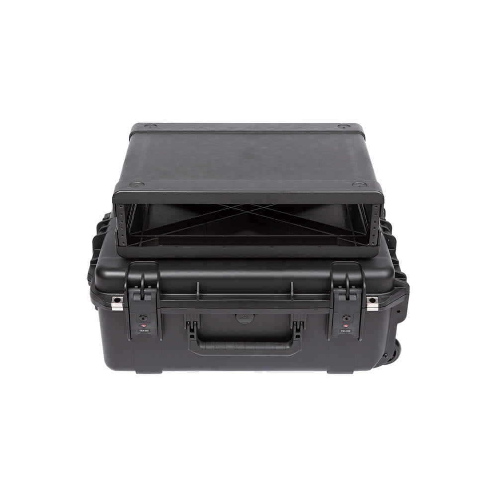 Featuring both injection molded cases and racks, our improved waterproof Fly Racks are lighter in weight and more affordable than previous models--all without compromising strength or durability. SKB's injection molded rack frames are manufactured alongside our iSeries cases in Orange, California. Rack frames are removable and fit easily into SKB's iSeries cases, where they are protected by high quality PE foam that provides space for protruding knobs and buttons. At less than half the weight of standard shock racks, SKB Fly Racks feature iSeries Watertight injection molded cases that are under 62 linear inches to keep from being oversized--the perfect solution for flying or shipping delicate equipment. Convenient in-line wheels and a push button release pull handle provides easy transport.