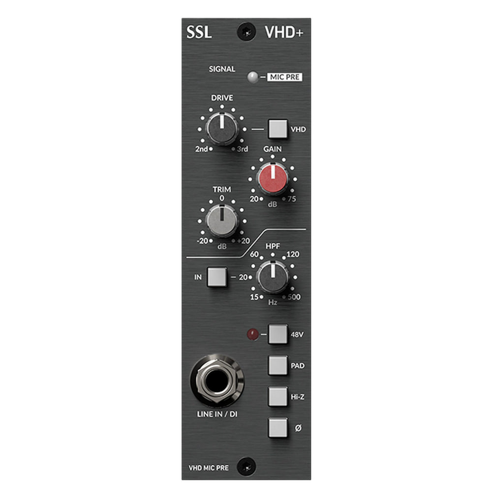 The VHD+ Pre Module for the popular 500 format modular rack platform makes the uniquely versatile VHD based preamp technology from Duality, SSL’s industry leading large format studio console, available for studios of all sizes. The VHD+ Pre module is an immensely versatile recording and processing device. It can deliver ultra clean SSL SuperAnalogue grade recordings but also features a switchable VHD mode. SSL’s patented Variable Harmonic Drive (VHD) system uses a 100% analogue signal path to generate rich harmonic distortion. Increase VHD input gain and the Variable Harmonic Drive process introduces either 2nd or 3rd harmonic distortion or a blend of the two to your source material. At lower gain settings it adds gentle valve-style warmth or a touch of transistor edge. As the gain is increased the more extreme the distortion becomes, until at high gain settings it delivers fierce trashy transistoresque grunge. The VHD+ Pre module gives the user ultimate versatility from a studio grade preamp. Whether it’s ultra-clean traditional SSL, subtle warming or totally trashy transistor distortion, VHD will change your expectations of what a preamplifier should deliver.