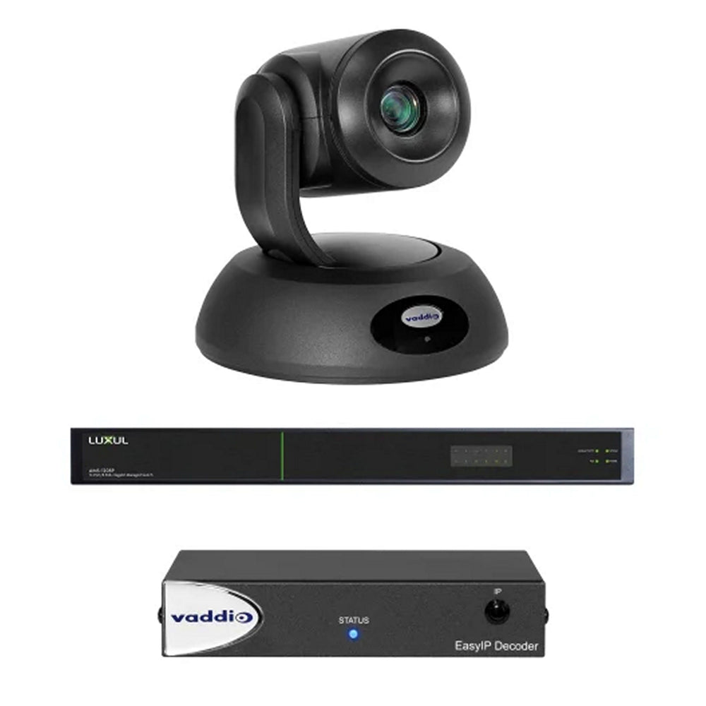 The Vaddio EasyIP 20 Base Kit (Model 999-30232-000) is a comprehensive AV-over-IP system designed to streamline video conferencing and streaming in medium to large environments such as conference rooms, lecture halls, and houses of worship. This all-in-one kit includes the EasyIP 20 PTZ camera, EasyIP Decoder, and EasyIP Switch, providing a seamless solution for capturing, streaming, and decoding high-definition video over a network.